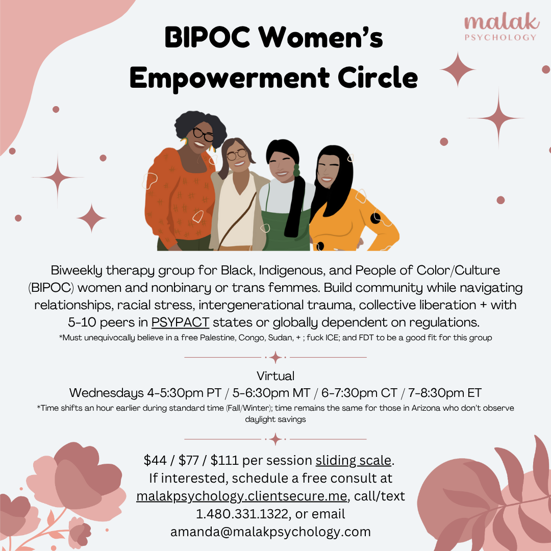 BIPOC Women’s Empowerment Circle is for a therapy group for Black, Indigenous, and People of Color/Culture (BIPOC) women and nonbinary or trans femmes. Build community while navigating relationships, racial stress, intergenerational trauma, collective liberation + with 5-10 peers in New York, PSYPACT states, or globally dependent on regulations.